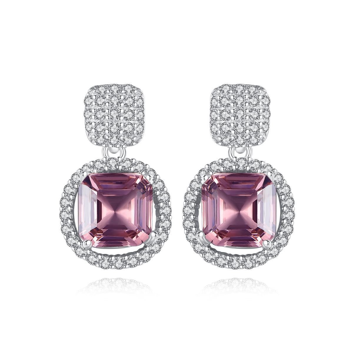 Graceful and glamorous, these blush pink drop earrings are designed to make an impression. Featuring a radiant square-cut pink centerpiece framed by a shimmering halo of pavé stones, they offer exceptional sparkle and elegance.